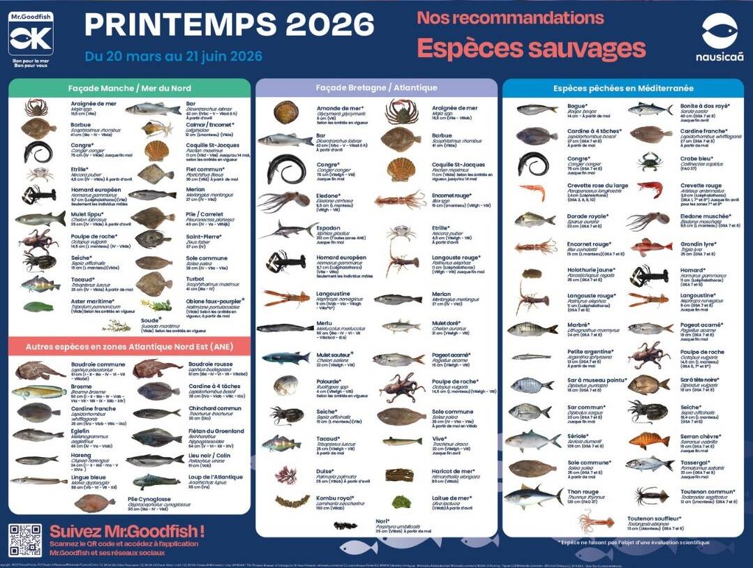 Porté par 3 aquariums européens (Nausicaá, en France, l’Acquario di Genova en Italie et l’Aquarium Finisterrae en Espagne), sous la tutelle du Réseau Océan Mondial, ce label européen a une devise claire comme de l’eau de roche “bon pour la mer, bon pour vous”. Le principe de Mr. Goodfish est de nous conseiller. Parce que les stocks de poissons et de produits de la mer ne sont pas illimités, il nous aide à faire les bons choix. Comme les fruits et légumes, ils existent une saisonnalité des produits marins, c’est pourquoi, à chaque saison, Mr. Goodfish publie son calendrier de recommandations, afin de nous aiguiller dans nos choix.